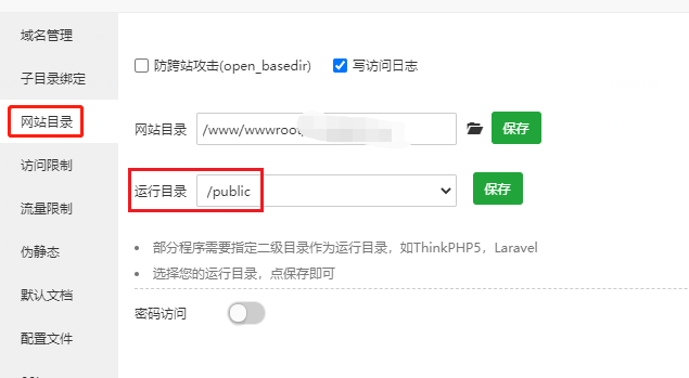 按下图提示,设置网站目录-->运行目录为'/public'